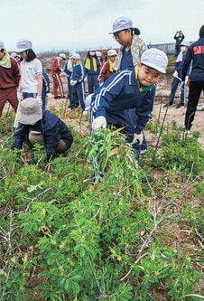 稚魚放流「大きくなってね」 益田、園児が波打ち際で体験