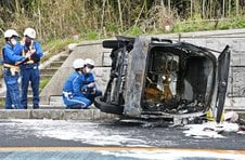 国道9号、軽自動車が横転し炎上 2人けが、大田市久手町 2時間弱、全面...