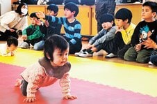 児童見守りハイハイレース 松江、美保関小で幼児20人
