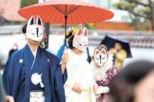狐面の一行、城下練り歩き 津和野でイベント