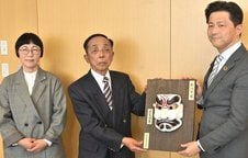 松江城で伐採のヒノキ使い神楽面 迫力あるスサノオノミコト 制作した宍道神楽面伍面会が市に寄贈
