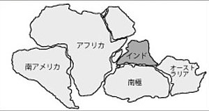 実は約5億年前には、インドは南極やオーストラリア、アフリカとともに南半球にあり、【図】のようなゴンドワナ大陸という大きな陸地をつくっていました。この大陸は約2億年前に分裂(ぶんれつ)しましたが、インドは徐々(じょじょ)に北上してユーラシア大陸と衝突(しょうとつ)して、ヒマラヤ山脈(さんみゃく)ができました。エベレストのような高い山は、インドがぶつかることによってできたのです。