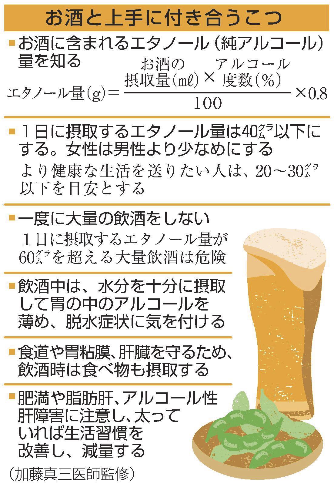 「お酒に含まれるエタノール量(グラム)の換算式は『(酒の摂取量・ミリリットル)×(アルコール度数)÷100×0・8』です。例えば度数5(%)のビール350ミリリットル1缶に14グラム、度数15(%)の日本酒180ミリリットル(1合)に22グラム含まれます」