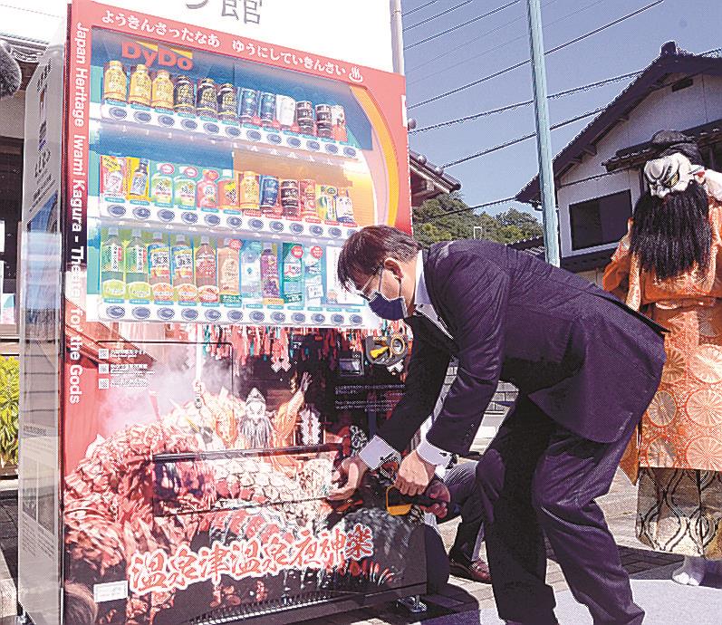 【大田】大田市温泉津町温泉津の温泉街入り口に位置する案内所「ゆうゆう館」前に4日、温泉街名物の夜神楽公演の舞をデザインした自動販売機がお目見えした。伝統芸能のPRに一役買うと同時に、売り上げの一部を観光振興に充て、新型コロナウイルス禍で落ち込む市域の集客の回復を狙う。