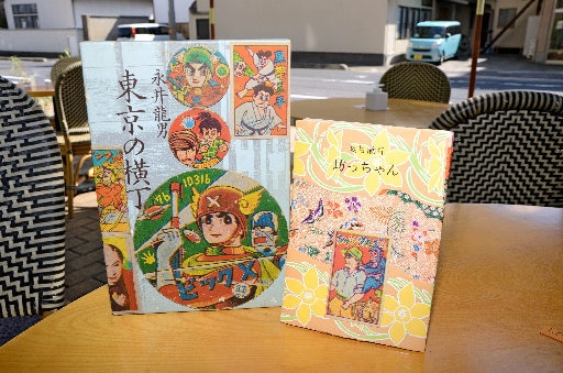デザインの発想は、長岡さんにしか思いつけないようなものが多いが、タイトルや内容からヒントを得ているものも。例えば、澁澤龍彦の短編小説集「うつろ舟」には、白、水色、青の刺しゅう糸で、舟が浮かぶ川を表現。永井龍男の小説「東京の横丁」は、少年時代の話が書かれていることから下町の少年をイメージし、コレクションの「メンコ」を貼り付けていた。