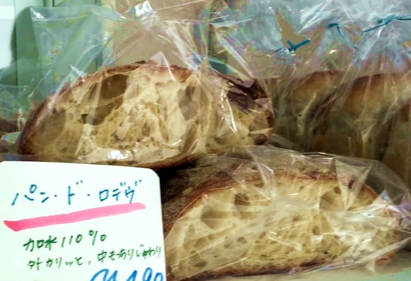 店頭には約20種類のパンが並ぶ。看板商品の「パン・ド・ロデヴ」(490円)は、シンプルなハードパン。外側はパリッと、内側はモチモチの食感が楽しめる。シンプルだからこそ感じられる甘みや風味が魅力だ。人気の「食パン」は、ホップ種とルヴァン種(粉と水で作る酵母菌)、それぞれの酵母から作った2種類を販売している(ホップ種340円、ルヴァン種350円)。香ばしさと小麦粉の甘みを感じられる「バゲット」(330円)も人気だ。
