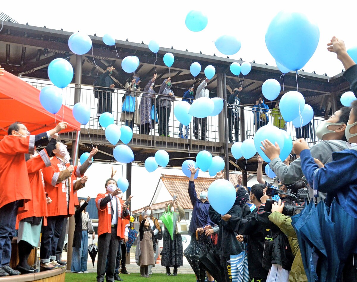 2016年10月21日に最大震度6弱を観測した鳥取県中部地震から丸5年の節目を前に17日、倉吉市中心市街地の打吹回廊を主会場に復興イベント「福高祭(ふっこうさい)」があった。県中部地区の観光地をオンラインで結んで一斉に風船を飛ばし、被災前以上の地域活性化への思いを新たにした。
