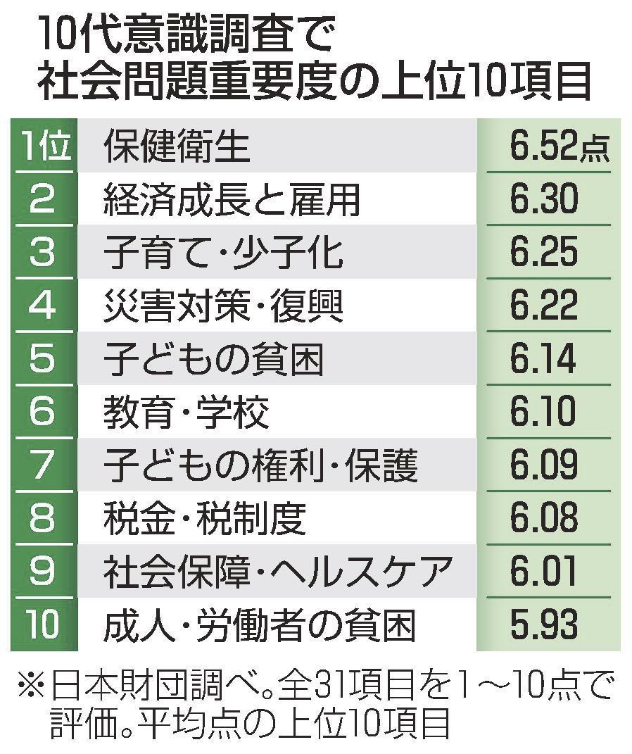 社会問題31項目について、衆院選でどの程度重視されるべきか1~10点で評価させたところ、新型コロナウイルスを含む「保健衛生」が平均6・52点で最も高かった。「経済成長と雇用」が6・30点で2位、「子育て・少子化」が6・25点で3位。憲法改正を含む「法律・司法制度改革」は5・59点で23位だった。
