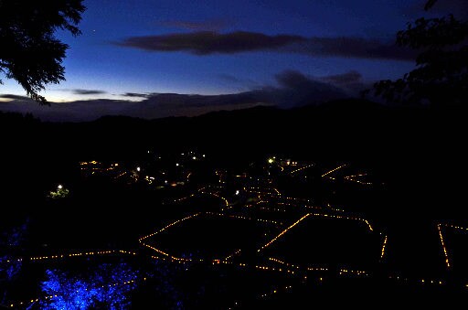 世界農業遺産の国内候補地、島根県奥出雲町竹崎の追谷地区で棚田がライトアップされた。夕闇の深まりとともにあぜに設置された約1万本の発光ダイオード(LED)灯籠が棚田を照らした。30日まで毎夜行う。
