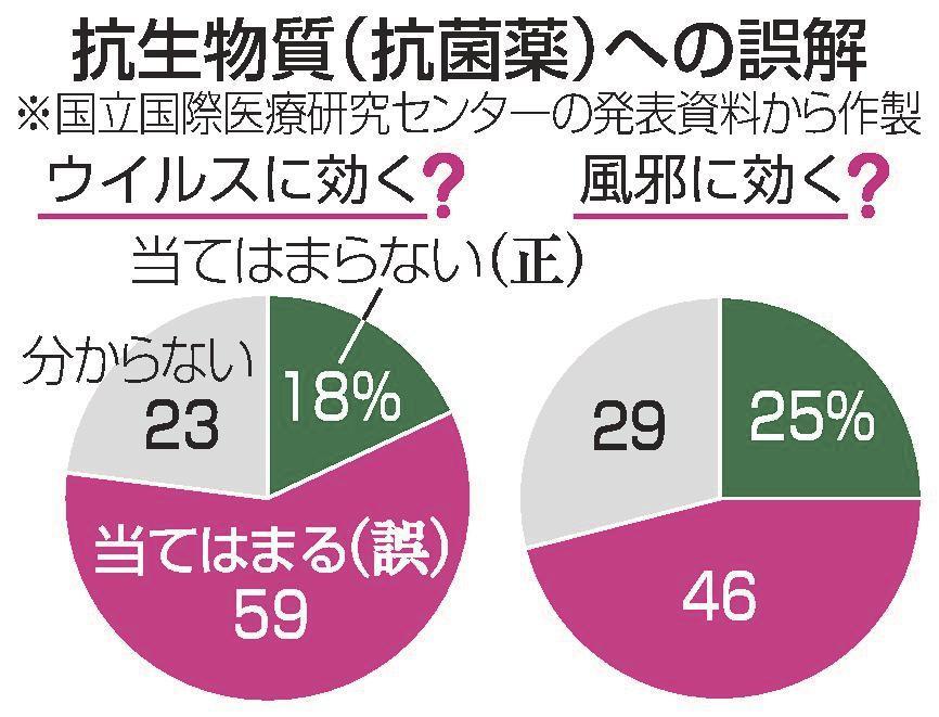 抗生物質(抗菌薬)がウイルスにも効くと誤解している人が依然として約6割いることが、国立国際医療研究センター病院の意識調査で分かった。分からないと答えた人が2割強、効かないと正しく答えられた人は2割に満たなかった。