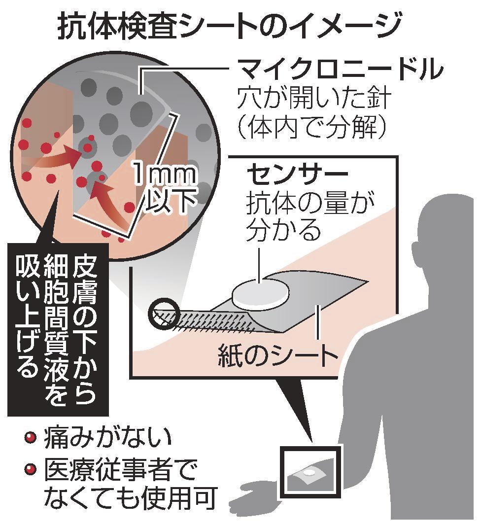 微細な針が並んだ紙のシートを腕に貼って体液を吸い上げ、センサーで抗体の量を検査する―。新型コロナウイルス対策に役立てようと、東大でこんな研究が進んでいる。蚊が人間の血を吸うのに似た方法で、元々は糖尿病予備軍の血糖値を測る目的で始まった。マウス実験や治験を経て実用化を目指す。