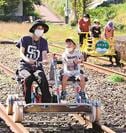 【川本】2018年で廃線となったJR三江線の線路をレールバイクで走るイベントがこのほど、島根県川本町川本の旧石見川本駅構内であった。町外から参加した親子連れら74人がエンジン式と足こぎ式の2種類を楽しんだ。