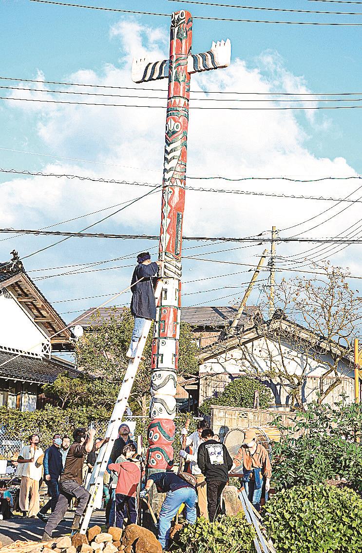 【大山】北米の先住民が地区の入り口の目印や墓標として制作するトーテムポールを住宅街に立てるイベントが7日、鳥取県大山町長田であった。住民ら約70人が力を合わせて制作し、地域のにぎわいを願った。