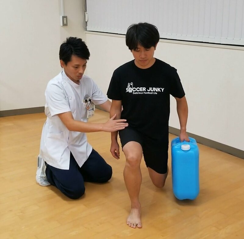 フォワードランジも太もも全体を鍛える運動だ。川本さんによると、より効果的に体幹を鍛えるために、一歩踏み出す際、ポリタンクを両手で持って前に伸ばし、早く大きく左右に振るという方法もあるという。
