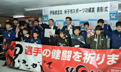 この日、ジムであった健康ボクシング大会に合わせ表彰に訪れた伊木隆司市長から、長年の指導に対する尽力をたたえられた。伊田さんは「金メダル以上に入江選手の人間性が称賛されていることがうれしい」と話し、ジュニア選手に囲まれて記念写真に納まり受賞を喜んだ。