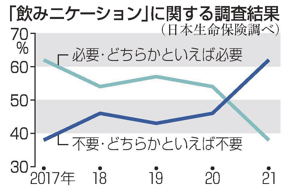 お酒を飲みながら職場の仲間と親交を深める「飲みニケーション」の支持率が急落している。日本生命保険の調査で「不要」との回答が6割に達し、2017年の調査開始以来、初めて「必要」の割合を上回った。日生は、新型コロナウイルス禍でお酒に頼らない親睦の在り方を模索する人が増え、意識が変化したとみている。