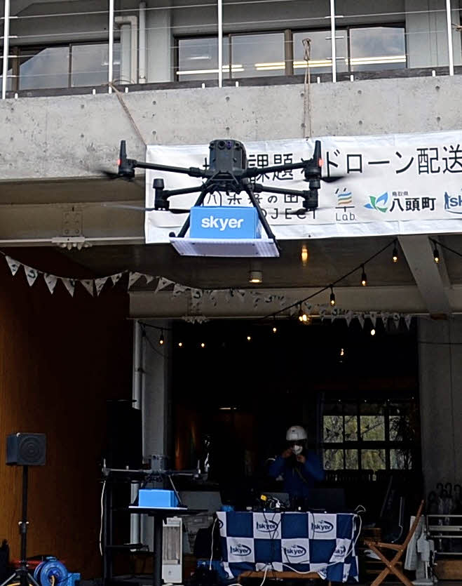 鳥取県八頭町を拠点にまちづくり事業を展開するシーセブンハヤブサと町などが25日、町内で小型無人機ドローンを使い、配食サービスや災害時の物資搬送を想定した県内初の実証実験を行った。中山間地域の課題解決を図るのが狙い。今後も実験を重ね、実用化の可能性を探る。