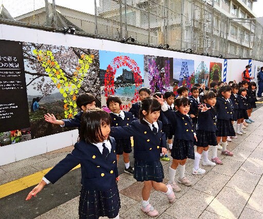 南北自由通路の建設工事が進むJR米子駅で30日、工事用防護壁に幼稚園児ら438人の手形をあしらったアートがお披露目された。米子城跡や皆生温泉、上淀廃寺跡など景勝地写真の上に、一人一人の手形で「YONAGO」とローマ字表記した作品。工事が完了する2023年まで設置される。