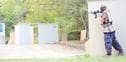 整備された約1ヘクタールの広場にはベニヤ板で作られたバリケードや、ドラム缶があちこちに並ぶ。身を隠せる場所が多いほか、2階建てのやぐらがあるため、立てこもったり上方から相手を狙ったりと、戦略性の高い戦いが楽しめるという。