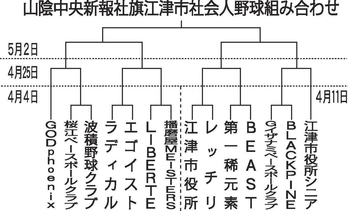第43回山陰中央新報社旗江津市社会人野球大会兼第54回同市野球連盟春季選手権大会(江津市野球連盟、山陰中央新報社主催)が4日、同市嘉久志町の市民球場で開幕する。
