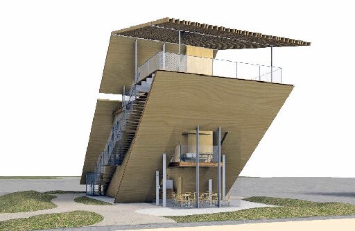カフェは2階建てで、延べ床面積は約190平方メートル。収容人数は110人で、地元で焙煎(ばいせん)したコーヒーを提供する。地上約9メートルの高さの屋上にオープンテラスを設け、砂丘を見渡せるという。エレベーターを導入し、車椅子でも上がれるよう工夫する。