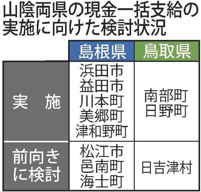 方針を受け、島根県は浜田、益田、川本、美郷、津和野の5市町、鳥取県では南部、日野両町が一括支給に向けて準備入り。先行する現金5万円は既に予算化しており、残る5万円の事業費は開会中の議会への補正予算案の追加提出、専決処分などで確保する。
