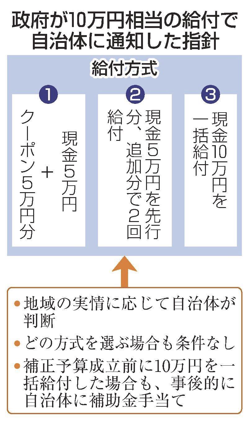 給付方法は(1)現金5万円とクーポン5万円分(2)現金10万円一括給付(3)現金5万円を2回―の3方式があり、どの方式で、いつ配るかは各市区町村に委ねられる。