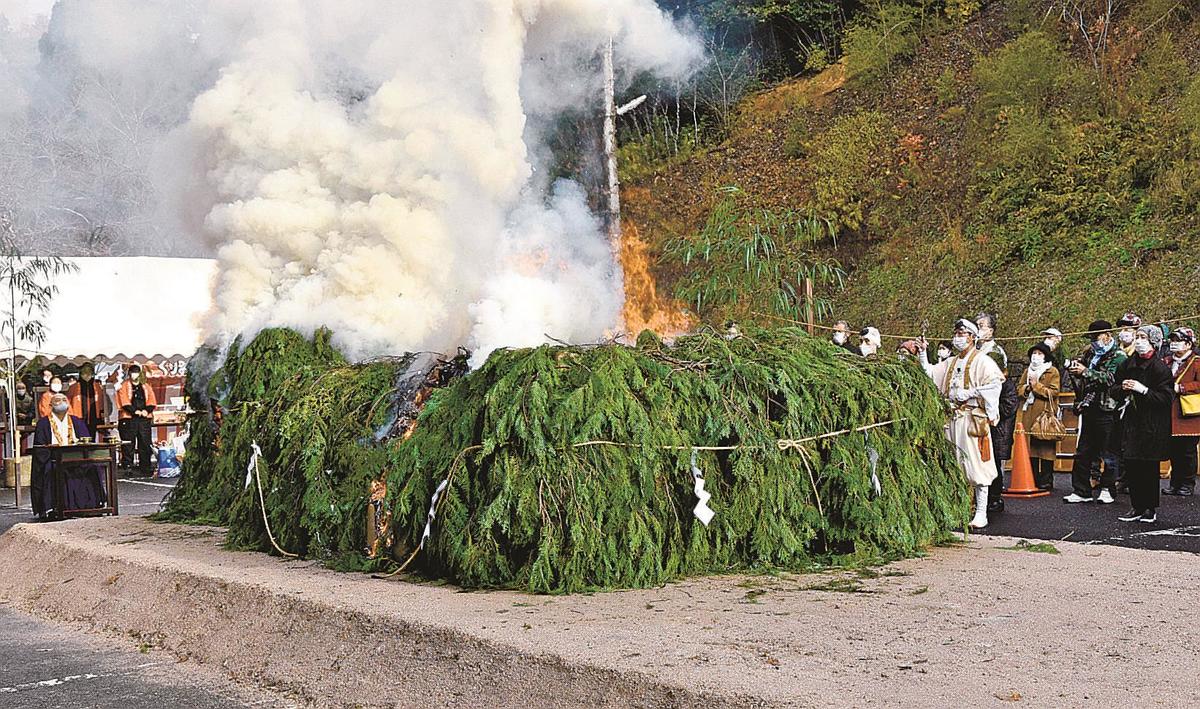 寺の駐車場にヒノキの葉や枝で覆った護摩壇を設け、山伏がホラ貝を吹いたり弓矢を放ったりする儀式をした後、たいまつで点火。清水谷善圭貫主(かんす)(74)が願文(がんもん)を唱え、参拝者の「身体健全」「心願成就」といった願いが書かれた護摩木を僧侶らが炎の中に投げ入れた。