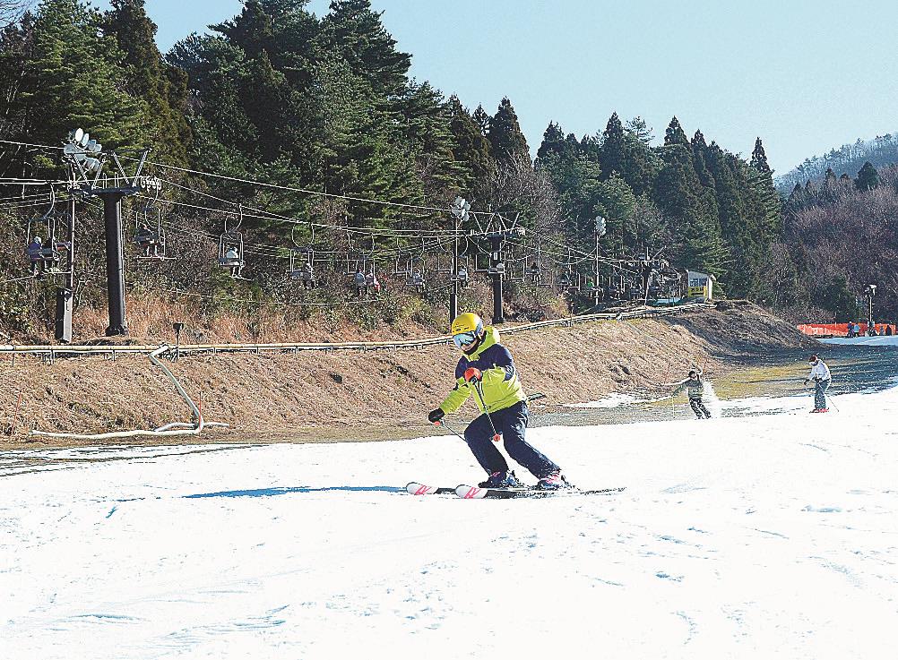 降雪機と造雪機を稼働させ、約60センチの積雪を用意。初心者向けのチェリーコース(400メートル)と、家族向けのファミリーパーク(70メートル)を開放し、若者や家族連れが晴空の下、ゲレンデを勢いよく滑り降りた。