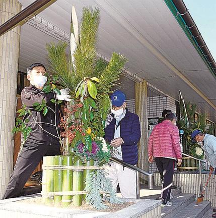 【安来】安来市シルバー人材センターの会員有志が24日、広瀬社会福祉センター(広瀬町広瀬)の玄関前に、高さ約2メートルの門松を設置して迎春準備を整えた。来年1月中旬まで飾る。