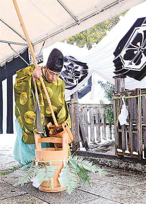 神紋入りの幕が張られた井戸の前に祭場が設けられ、米粉を水で練ったしとぎ団子とお神酒が供えられた。千家尊祐(たかまさ)宮司が祝詞を奏上した後、サカキの小枝を両手に持ち、琴板を打つ音と神歌に合わせて神舞を奉納した。