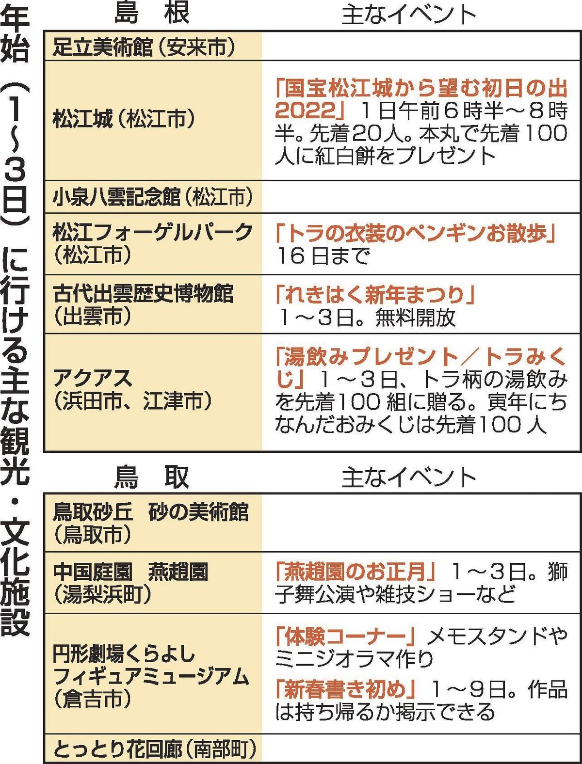 松江城(松江市)は1日午前6時半、初日の出を望む催しがある。本丸では先着100人に紅白餅が配られる。古代出雲歴史博物館(出雲市)は1~3日を無料開放し、正月遊びの体験やくじ引きが楽しめる新年まつりを開く。