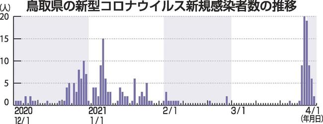 鳥取県内で3月下旬から新型コロナウイルスのクラスター(感染者集団)が2件立て続けに発生した。感染者が急拡大した関西地方から持ち込まれた可能性があり、変異株のほか、感染力が強い比較的多量のウイルスが確認されているのが特徴だ。県は「第4波」との認識を強めている。 (藤井俊行)