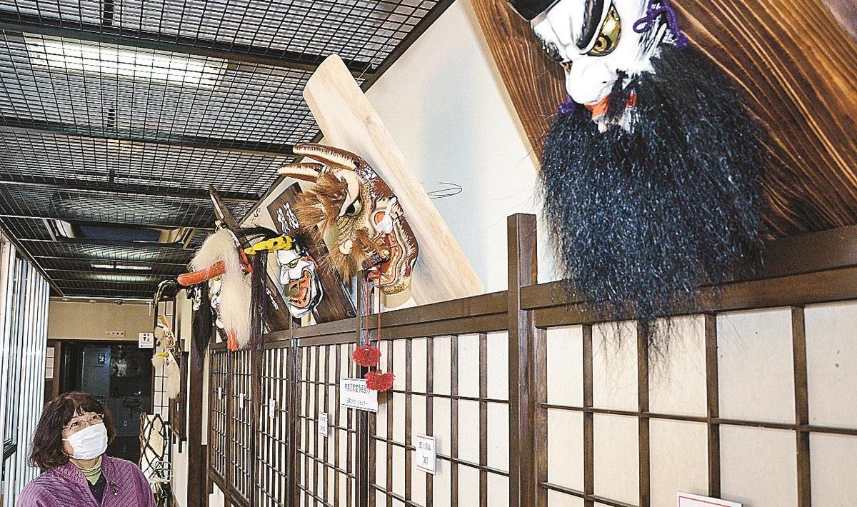 三隅まちづくりセンター(浜田市三隅町向野田)が週に1回開く創作教室で制作。2021年5月から半年かけて完成させた。鋭い目つきでにらみを利かせる男鬼、勇ましい顔立ちの鍾馗(しょうき)、赤く高い鼻が特徴の天狗が並ぶ。繊細な色使いで仕上げた狐の面もあり、それぞれ異なる表情が楽しめる。