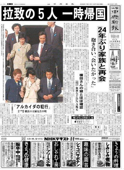 10月16日付 拉致被害者5人が帰国。9月17日に初の日朝首脳会談が行われ、北朝鮮の金正日総書記が拉致を認めた