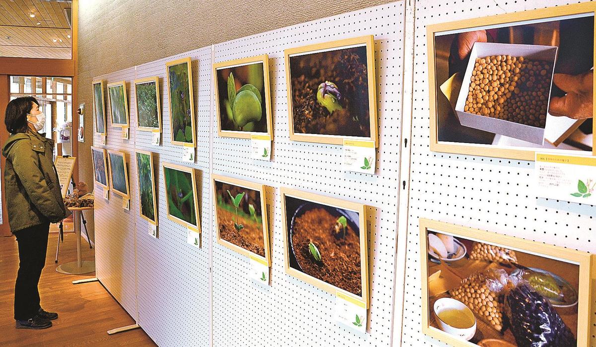 会場には、大豆の発芽やかわいらしい紫色の花、霜がついたさや、天日干しの様子の写真を展示。蒸した大豆や原料にして造られたみそを写した作品もあり、栽培から加工までの「一生」を説明文を付けて紹介している。