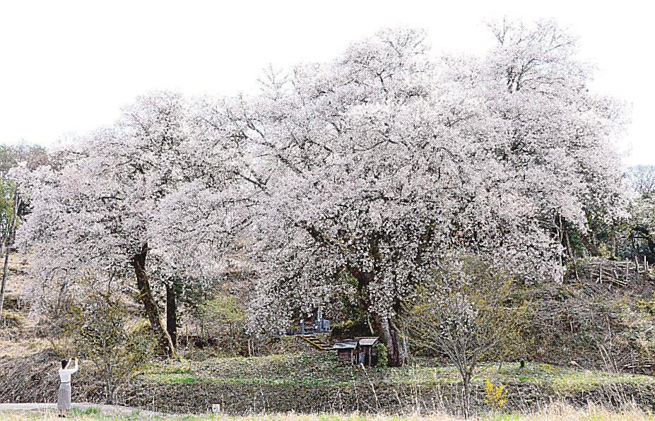 今年は例年より1週間程度早い1日に開花し、5日に満開となった。隣の推定樹齢100年のヤマザクラとともに花見客が記念撮影を楽しみ、ゆったりと観賞している。