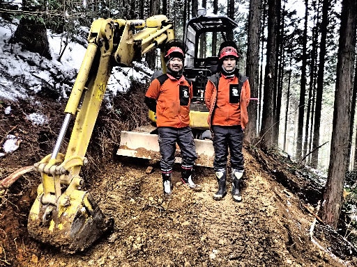 森師研修員は3年間、山口県と接する幸地地区の町有林7ヘクタールで、木材搬出用の作業道整備や間伐作業に従事する。2人は重機免許を取得し、専門家から木の切り方や作業道の作り方を学び、着任半年後には、こなせるようになった。
