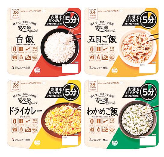 湯を注いで5分で食べられる長期保存食「安心米クイック」を、アルファー食品(出雲市大社町北荒木)が発売した。白飯、五目ご飯、ドライカレー、わかめご飯の全4種で、優しい食感が特徴だ。