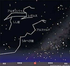 そこから左上の高い位置にはレグルスという1等星があり、こちらは、しし座の心臓にあたります。1等星の中では最も暗い星で、近くにはそれより少し暗いだけの2等星アルギエバもあります。