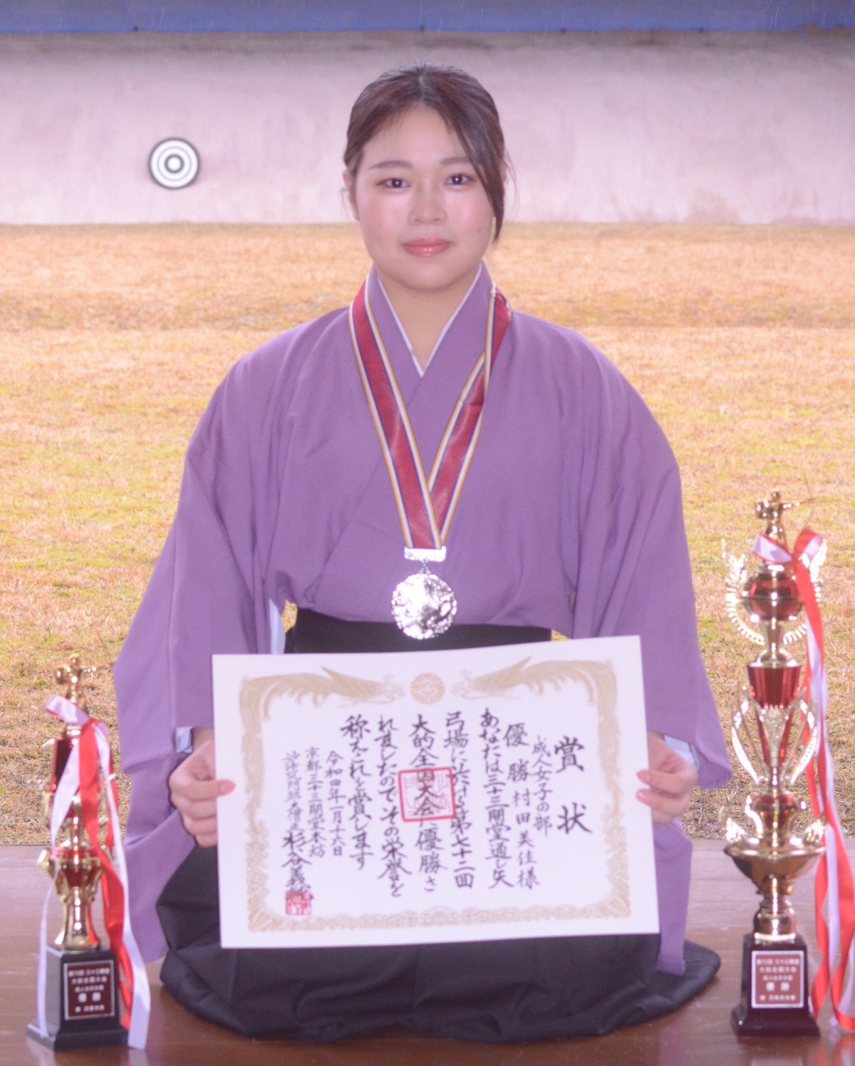 全国から集まった千人もの新成人が弓道の腕前を競う、三十三間堂(京都市)新春恒例の大的(おおまと)全国大会で、大田市出身の専門学校生、村田美佳(はるか)さん(19)=四段、大田市弓友会所属=が「成人女子の部」で優勝した。村田さんは「一生に一度の憧れの舞台で優勝でき本当にうれしい」と喜ぶ。