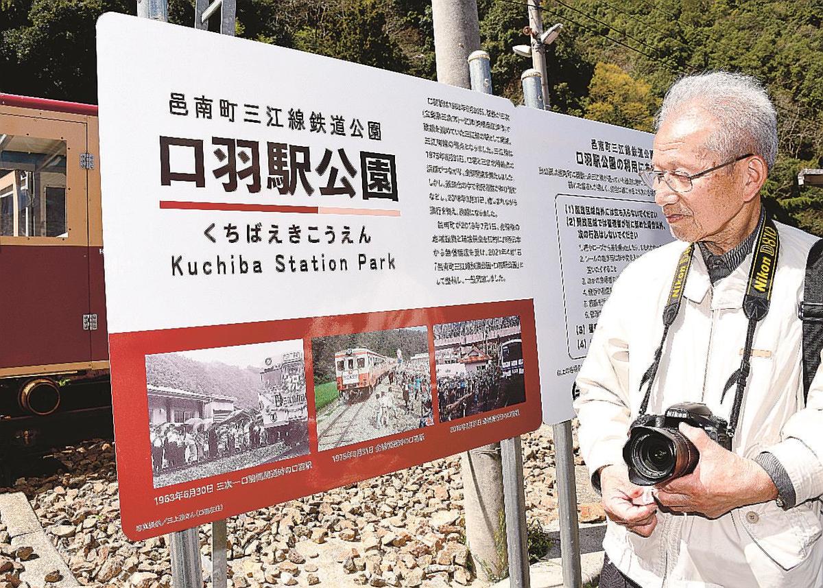 旧JR三江線の口羽駅(邑南町下口羽)と宇都井駅(同町宇都井)を活用した三江線鉄道公園の開園をひときわ喜ぶ男性がいる。三上茂さん(84)=同町下口羽=で、口羽駅が開業した当時から2018年3月末の廃線まで現地の様子をカメラで撮ってきた。公園に設置された看板にも三上さんの写真が使われており「鉄道公園として残してもらえるのはありがたい」と話す。(糸賀淳也)