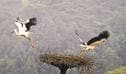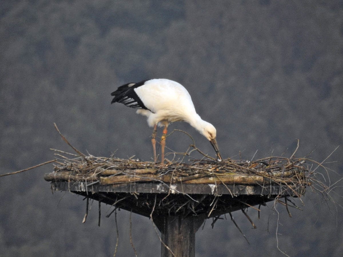 つがいは雄「げんきくん」と雌の「ポンスニ」で、昨年12月から、高さ12メートルの巣塔にある直径1・6メートルの鉄製の台にひんぱんに飛来。繁殖活動のための下準備とみられる。
