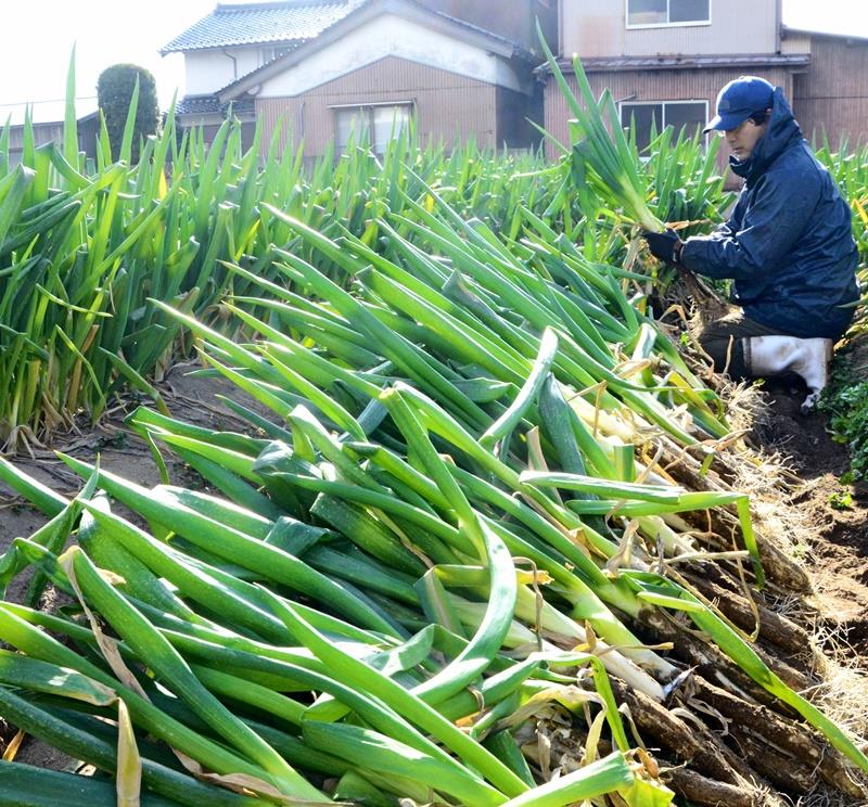 出雲市内で栽培される「神在ねぎ」が収穫のピークを迎えている。柔らかく、加熱することで甘みが増すのが特徴で、農家が寒さの中で育った冬の味覚を丁寧に抜き取っている。