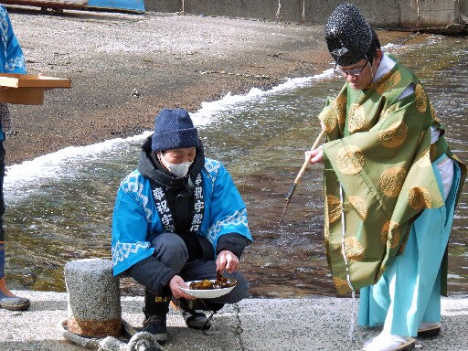 昨年同様、悪天候と新型コロナウイルス感染防止のため、祭場を権現島からJFしまね宇龍出張所に変更。住民ら約30人が参列する中、神職が岸壁で刈り取ったワカメを供えた。