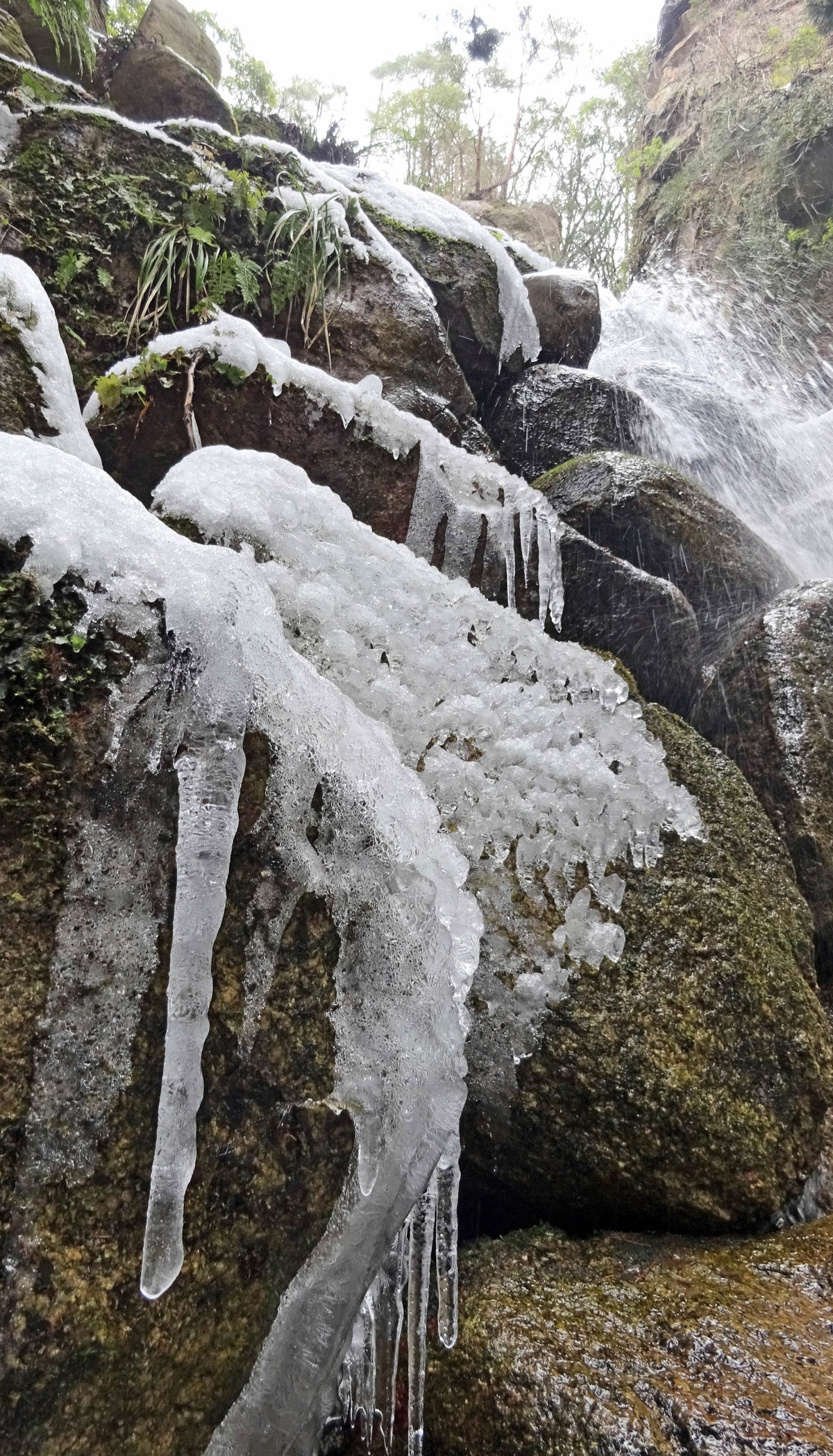 今季のつららは、大寒入りの寒波で少しずつ成長。小滝では長さ30~40センチに伸びた氷が岩肌に張り付き、水しぶきを浴びていた。