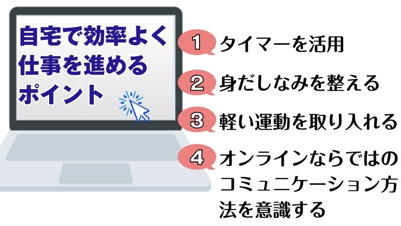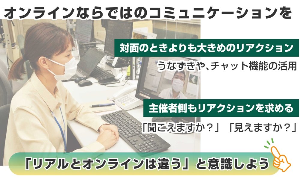 参加者だけでなく主催者側も、こまめにリアクションを求める、伝わっているか確認するなど、対面での会議よりも丁寧にコミュニケーションを取ると良い。