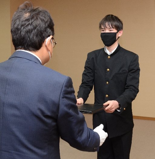 昨年8月の第43回全国中学校軟式野球大会で島根県勢として初優勝を果たした大田第二中学校野球部の勝部友悠前副主将が、受賞者を代表して「培った経験を生かし、日々の努力を大切にして、どんなことも乗り越えていく」とあいさつした。