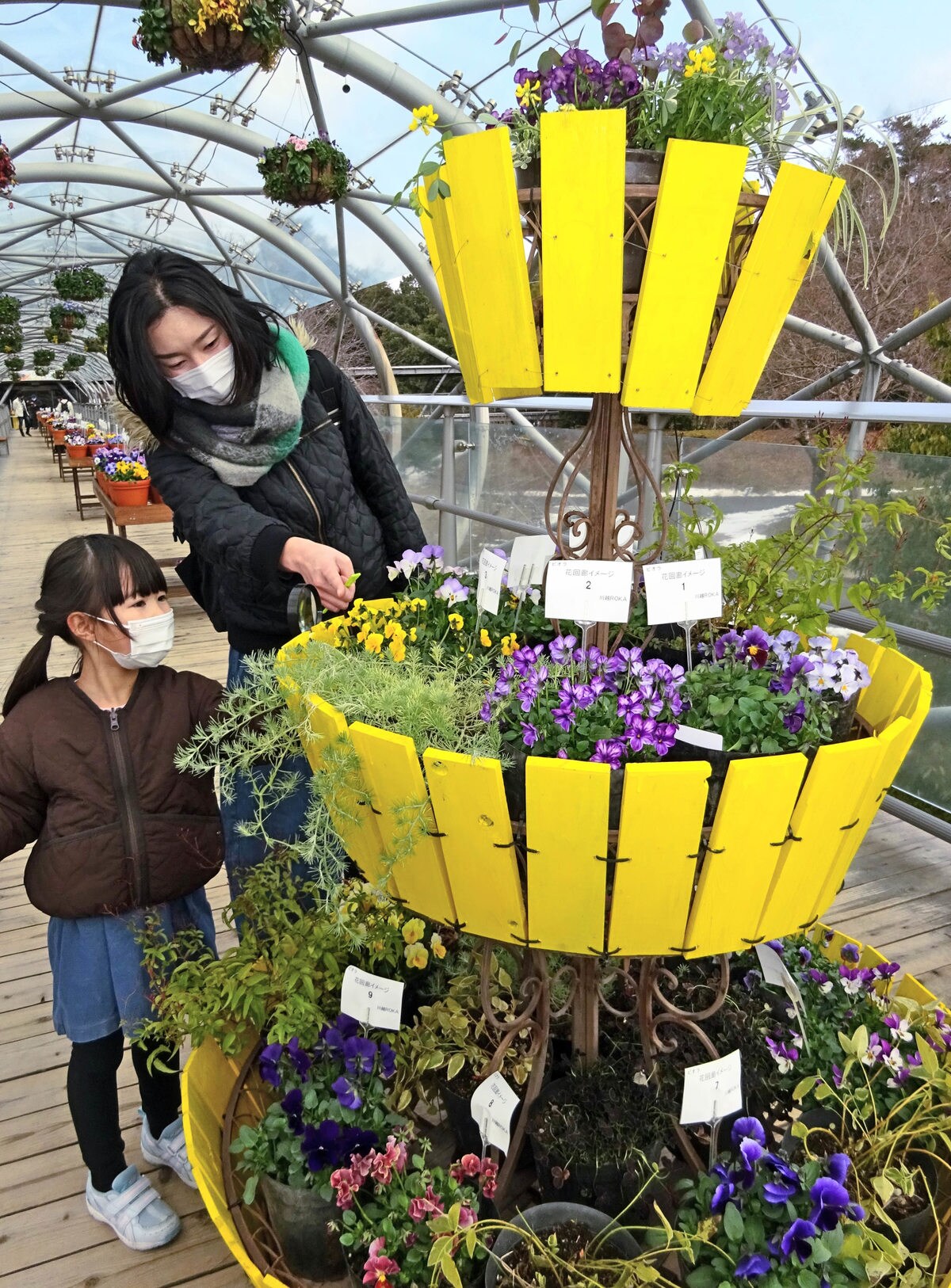 全長100メートルの展望通路クリスタルロードを会場に、異国情緒を醸し出すプティシャトン・オランジア(パンジー)や、紙細工のようなフリルをまとったキャンディーウエーブ(ビオラ)などの品種がずらり。
