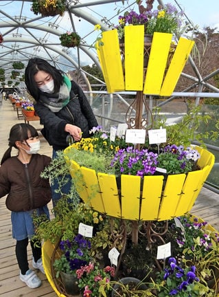 鳥取県南部町鶴田の花のテーマパーク「とっとり花回廊」で、春恒例の「パンジー・ビオラ展」が開かれている。県内外の花苗メーカーや生産者、育種家が新品種など約450種を出品。色とりどりの花が甘い香りを放ち、来園者を魅了している。3月31日まで。